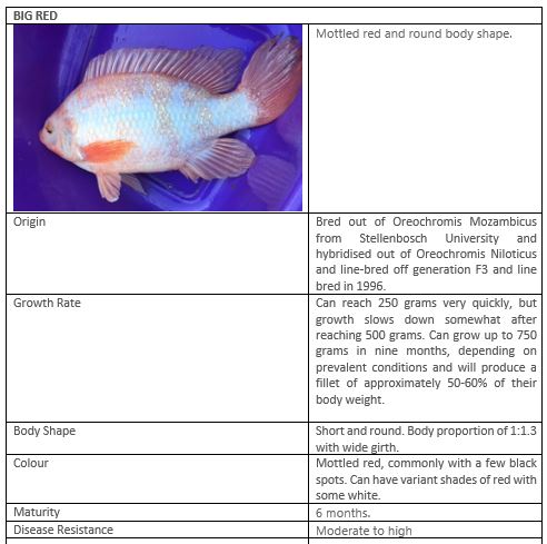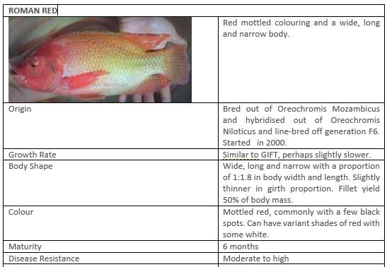 Our three Tilapia bloodlines have been carefully selected and bred to produce fast-growing fish of the highest quality. Our bloodlines include GIFT Tilapia, as well as our very own excellent Roman Red and Big Red SP (Special Red) Tilapia strains. The Special Reds are known in South Africa as “SA GIFT”.